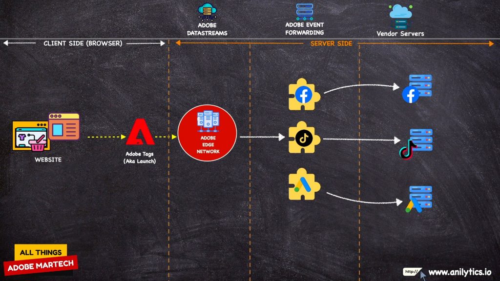 Let's quickly visualise how the set up works and the data flow which happens from the browser (client) to adobe servers and finally reaching the vendor destinations.