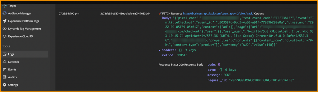 Event forwarding requests and status can be seen under "logs" within Adobe debugger. Here's a snapshot of the debugger and a formatted view of the data sent to TikTok servers.