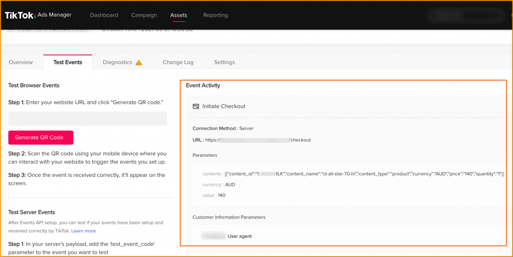 An end to end testing would involve an event happening on browser –> Adobe Event Forwarding Pixel sent –> TikTok Diagnostic Log. Use Adobe Debugger chrome extension for both Adobe Tags (Launch) and Adobe Event forwarding logs, followed by Tiktok Diagnostic Log to confirm the event is received.