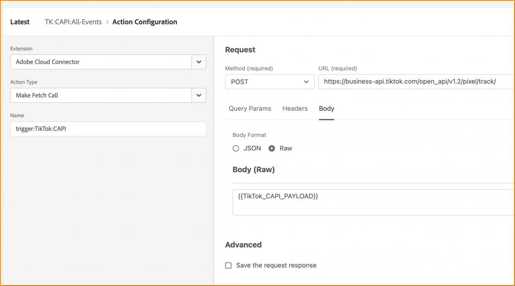 The raw event data as shown above will now be used for "evaluation of rules" within Adobe Event Forwarding eventually firing the action to send TikTok Conversion API. Here are some of the steps before we trigger the CAPI pixel action within Adobe Event Forwarding