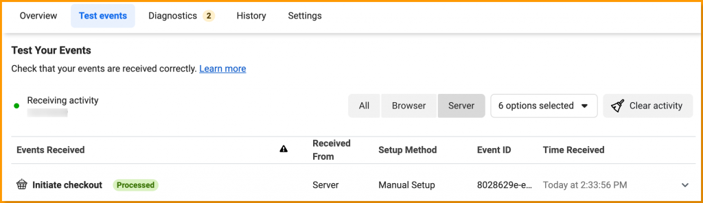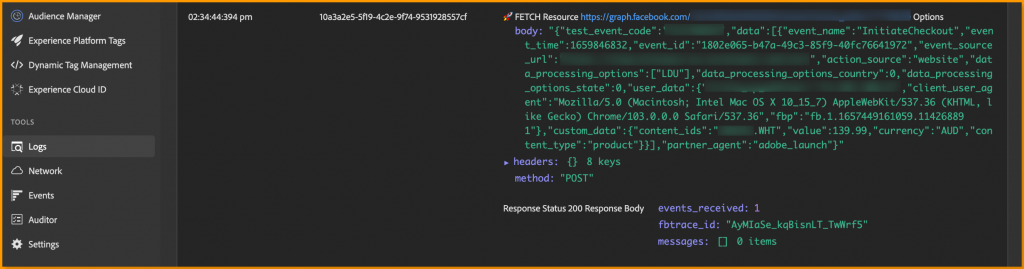 An end to end testing would involve an event happening on browser –> Adobe Event Forwarding Pixel sent –> FB Diagnostic Log. Use Adobe Debugger chrome extension for both Adobe Tags (Launch) and Adobe Event forwarding logs, followed by Facebook Diagnostic Log to confirm the event is received.